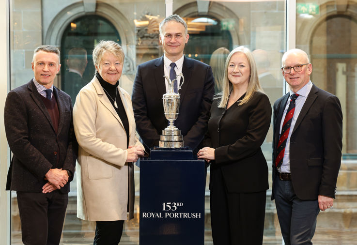 Photo caption: (L-R) David Jackson, CEO of Causeway Coast and Glens District Council, Ellvena Graham, Chair of Tourism NI, Johnnie Cole-Hamilton, Executive Director - Championships at The R&A, Aine Kearney, Director of Events at Tourism NI and David McMullan, deputy chair of the championships committee at Royal Portrush Golf Club.