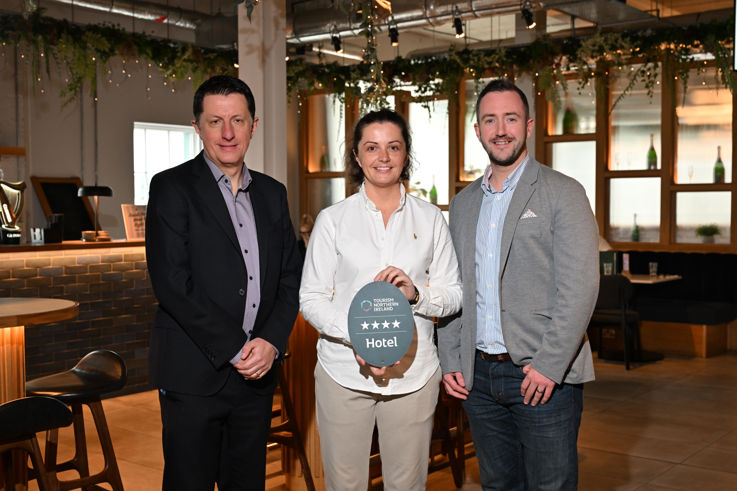 Photo caption: (L-R) David Roberts, Director of Strategic Development at Tourism Northern Ireland pictured with Lauren McNeill, Group Operations Manager at Haslem Hotel and Niall Burns, Director of Hospitality at Haslem Hotel, which has been awarded four stars by Tourism NI’s Quality Grading Scheme